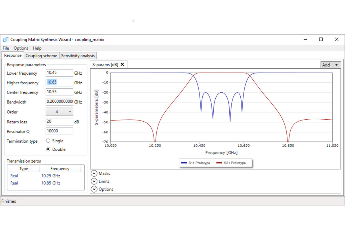 WiComm's bandpass synthesis wizard allows a fast synthesis of the coupling matrix for a bandpass filter with a generalized Chebyshev response and required specification (filter order, return loss level, defined pure-imaginary transmission or complex transmission zeros and filter topology). The resulting coupling matrix is an excellent starting point for a filter design. The bandpass synthesis wizard uses a unique technique for coupling matrix synthesis, which is capable to find the couplings for various non-standard, unique topologies including several load (source)-resonator and direct load-source couplings.
